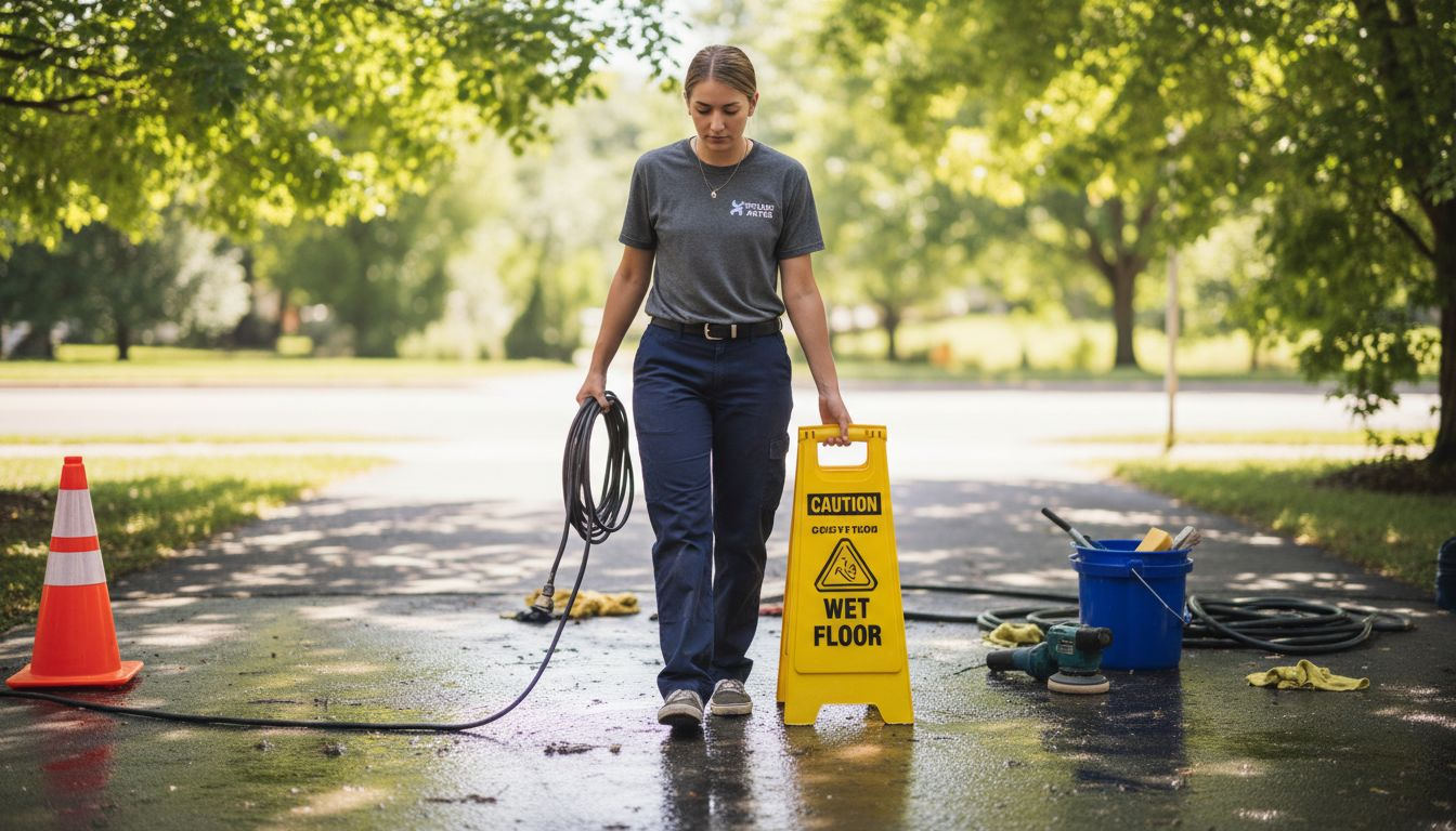 Wet driveways, tangled hoses, and power cords create slip and fall risks. Pressure washers deliver enough force to cause serious injuries. Polishing equipment can catch loose clothing or hair. Lifting 40-pound buckets repeatedly strains backs and shoulders.