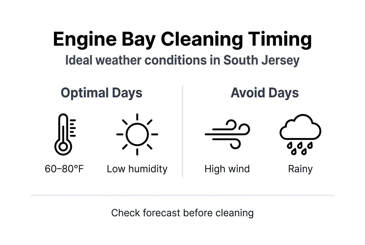 Plan your engine bay cleaning around weather forecasts. Check conditions the day before and morning of your planned session. The South Jersey interior cleaning guide also emphasizes working with regional climate conditions for best results.