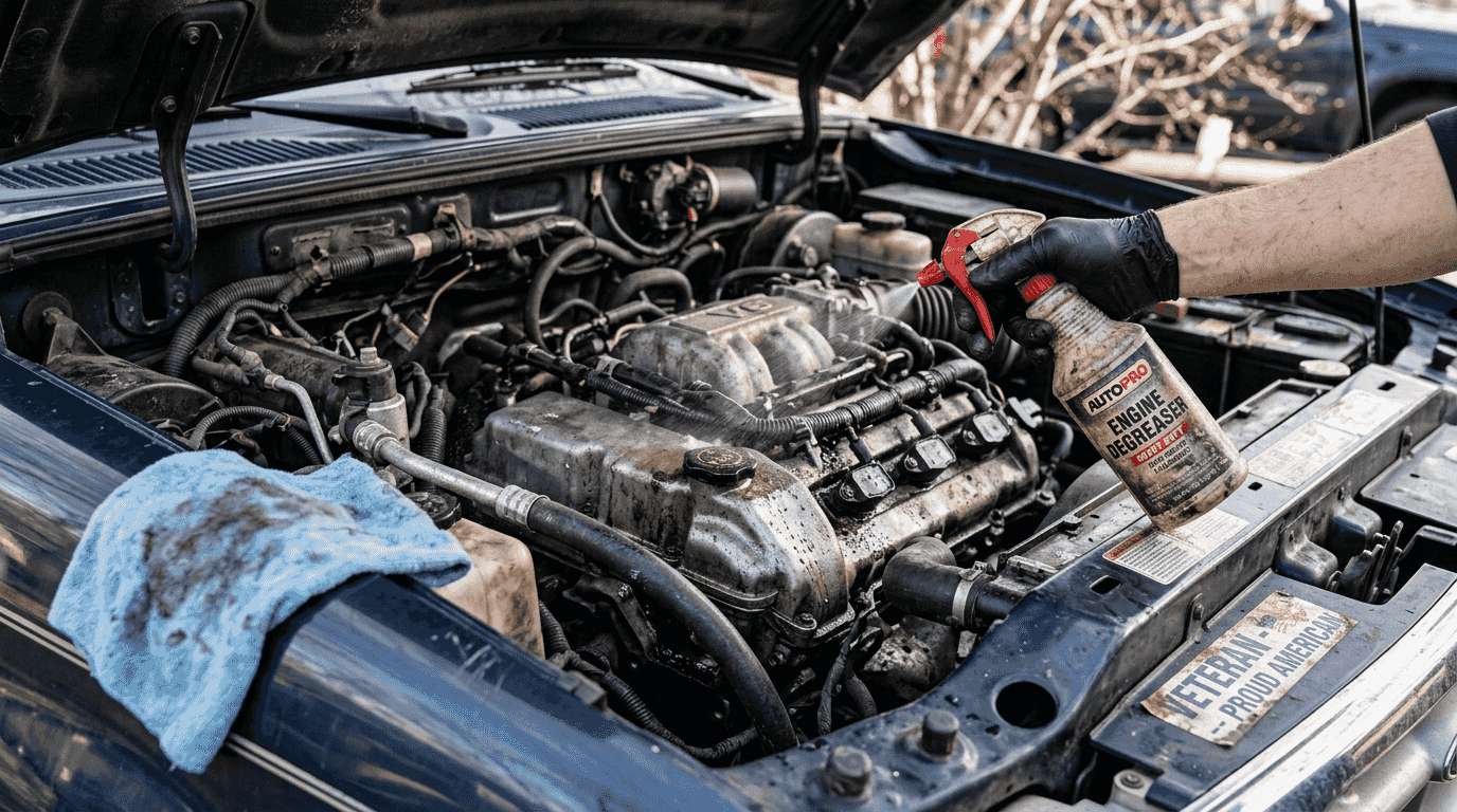Dedicated engine bay degreasers diluted according to manufacturer instructions work best for safe, effective cleaning. Avoid harsh industrial chemicals, household cleaners, or products not specifically formulated for automotive use, as these can damage plastics, rubber seals, and painted surfaces in your engine compartment.