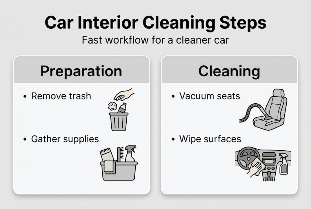 For a more detailed breakdown, this step by step car interior cleaning guide walks through each phase with additional tips.