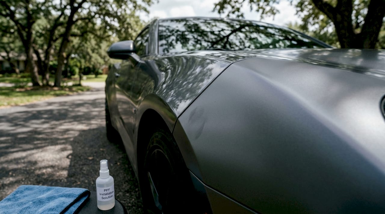 A proper PPF install requires thorough prep including wash, clay, and IPA wipe-down, followed by careful squeegeeing, heat gun work at edges, and a 24 to 48 hour cure period.
